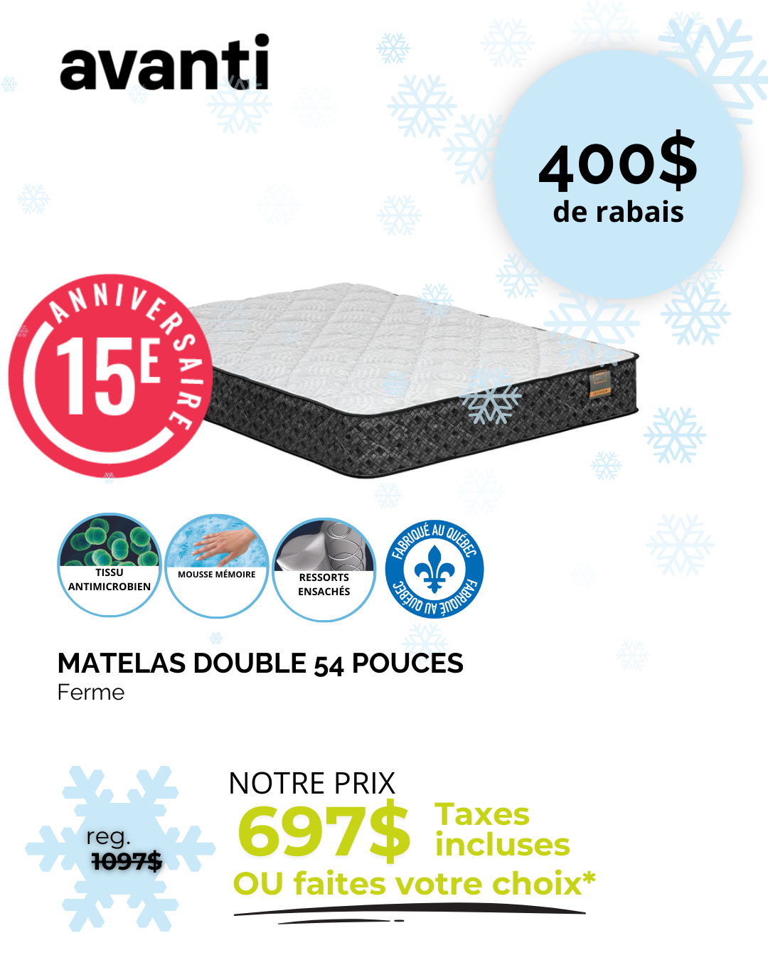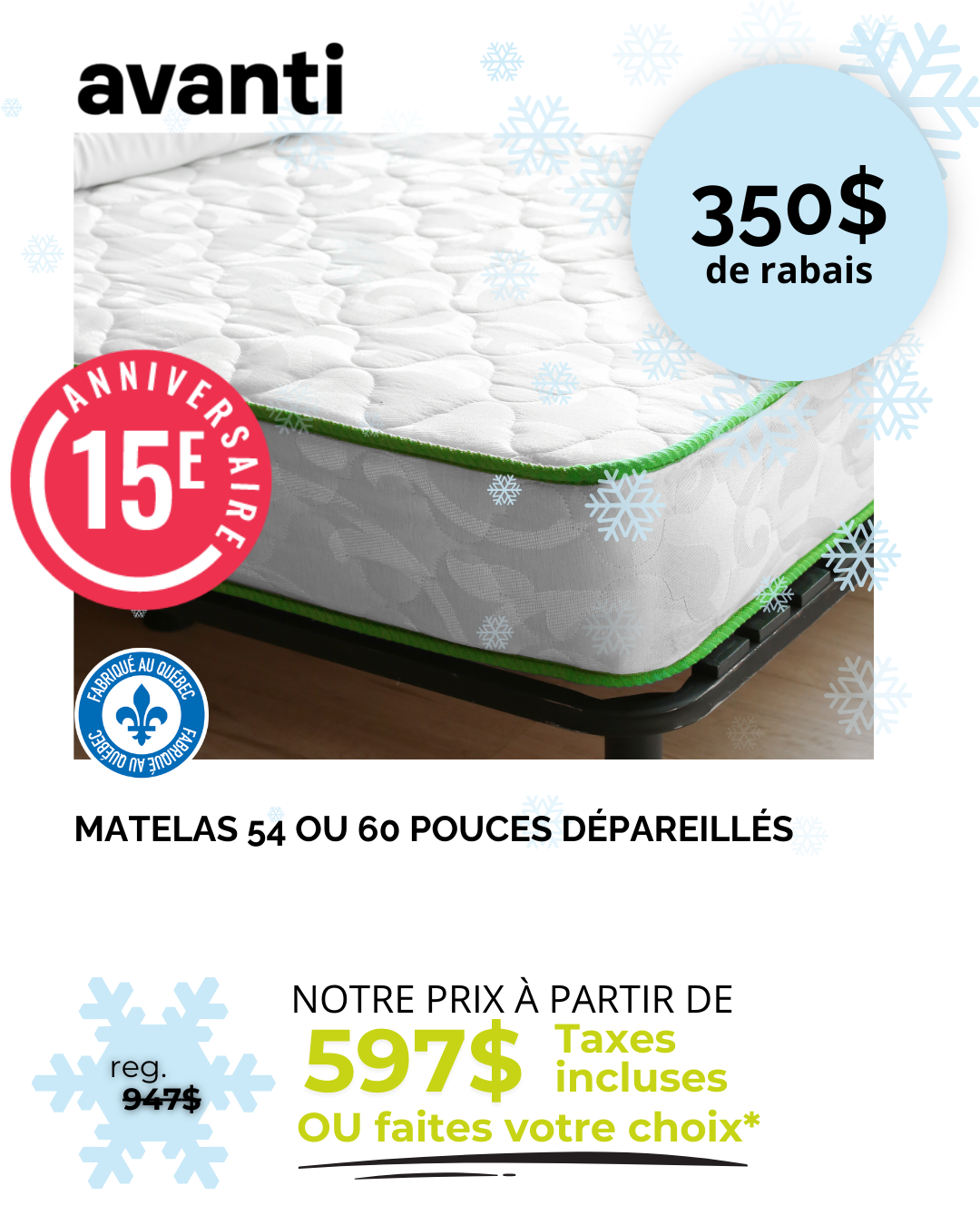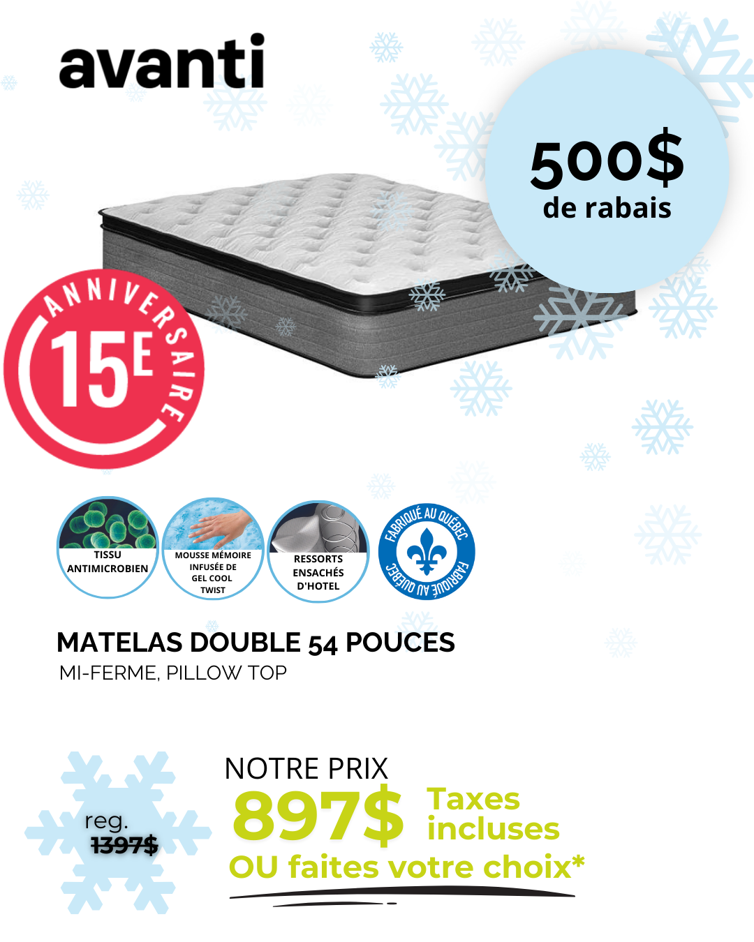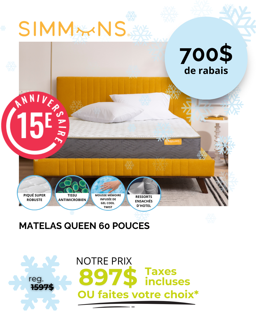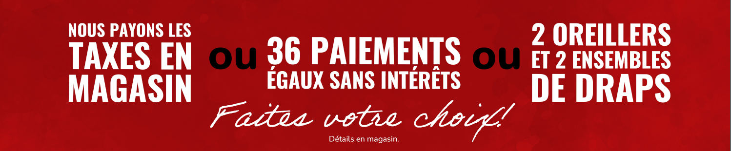*Rabais déjà appliqués sur les prix affichés. Ne peut être jumelé à aucune autre offre. Détails en magasin. *Sur prix suggéré du fournisseur. Détails en magasin. ** Nous payons l’équivalent de la TPS et de la TVQ. Détails en magasin. *** Jusqu’à 36 versements égaux avec dépôt de l’équivalent des taxes. Frais annuels de 35$. Détails en magasin. † À l’achat d’un matelas d’une valeur minimum de 999$ avant taxes. ††† Nous payons les taxes pour vous. Détails en magasin. S.A.C. Aucun ajustement de prix sur les promotions antérieures, même si la marchandise n’a pas encore été livrée. Le marchand ne peut être tenu responsable des erreurs techniques et typographiques qui auraient pu s’y glisser. Les articles peuvent différer légèrement de ceux illustrés, malgré tout soin apporté à la préparation de cette circulaire. Livraison gratuite. Détails en magasin.