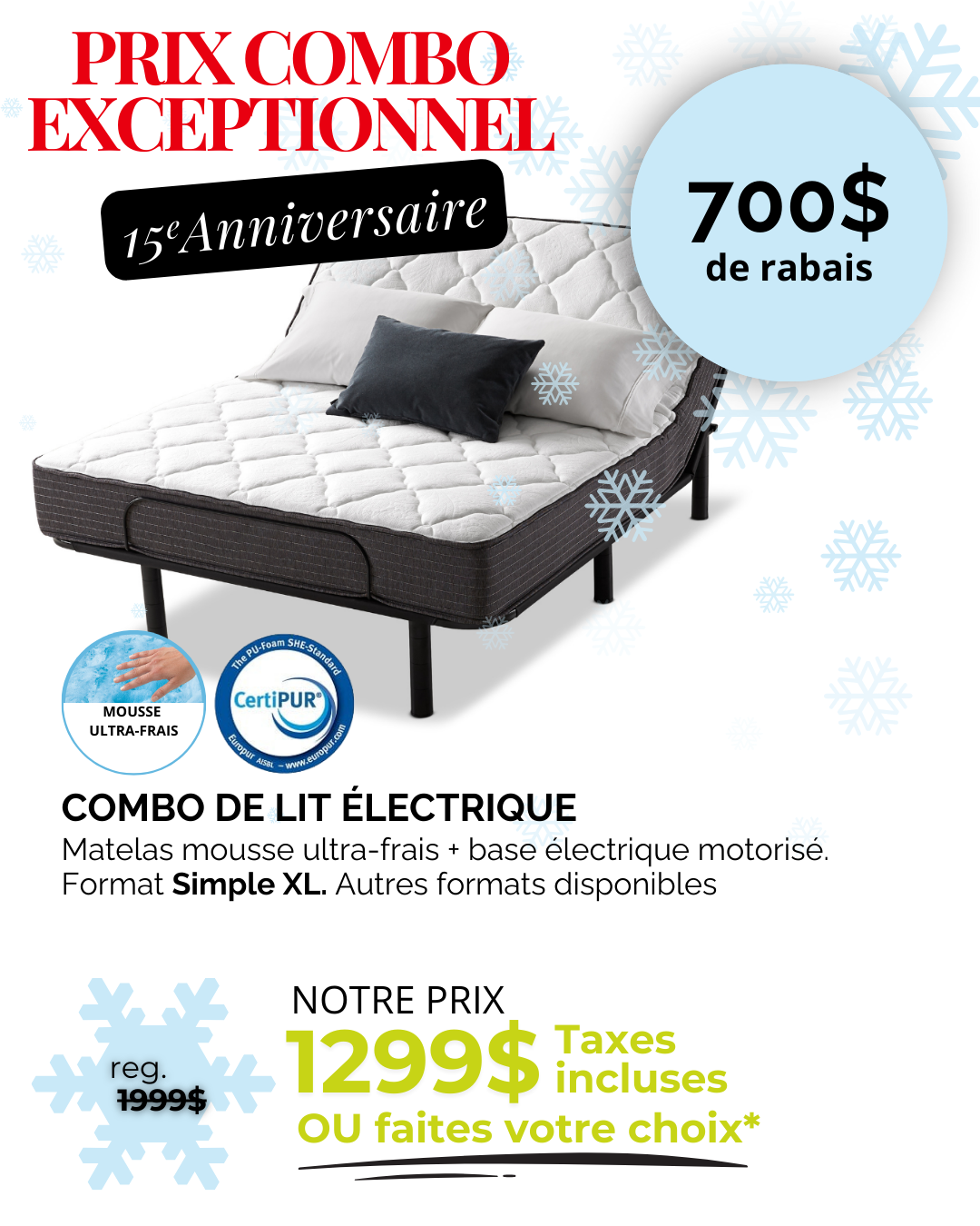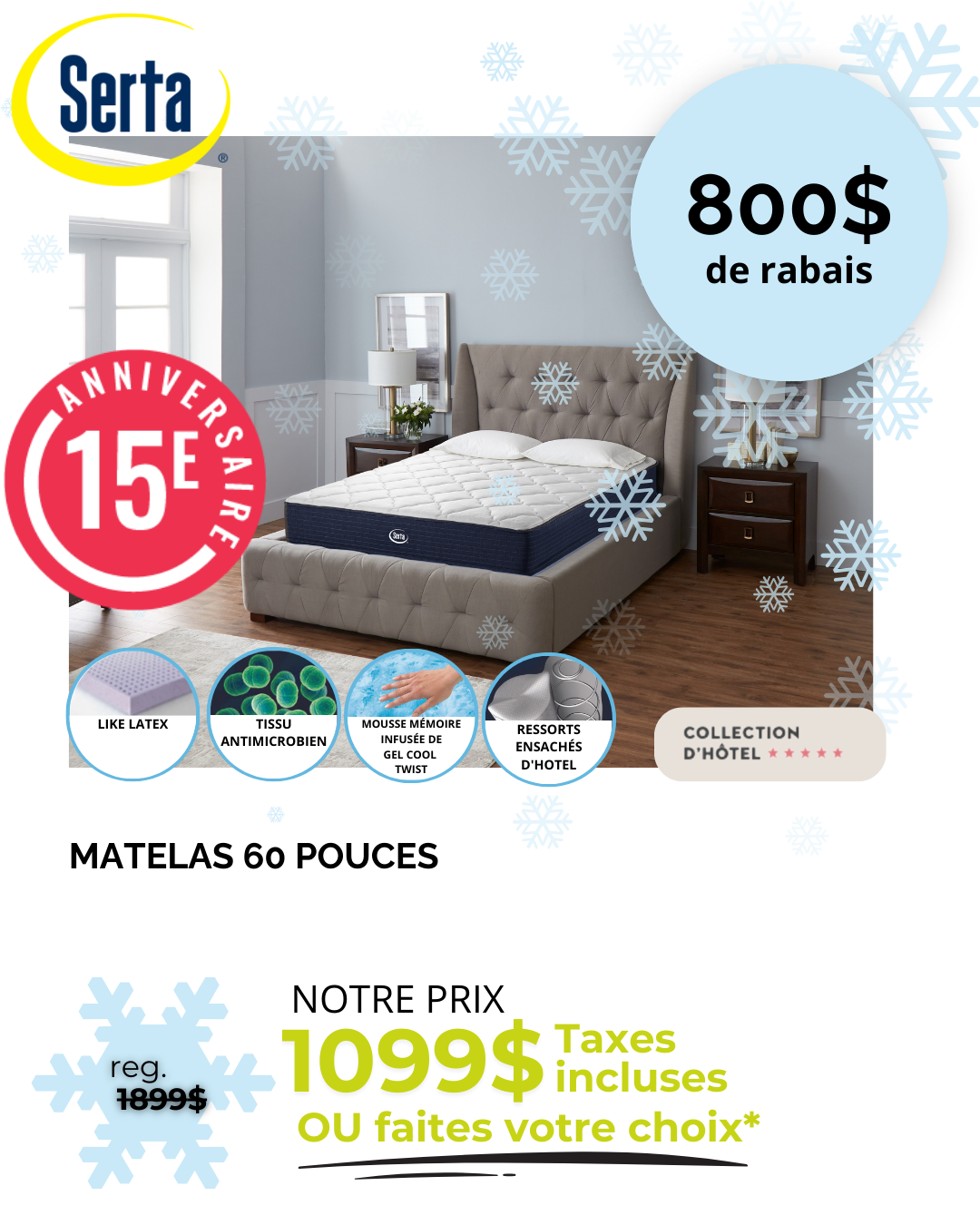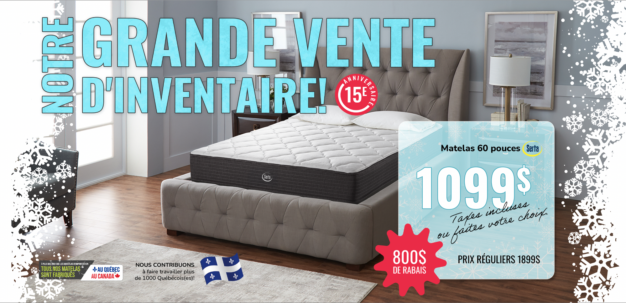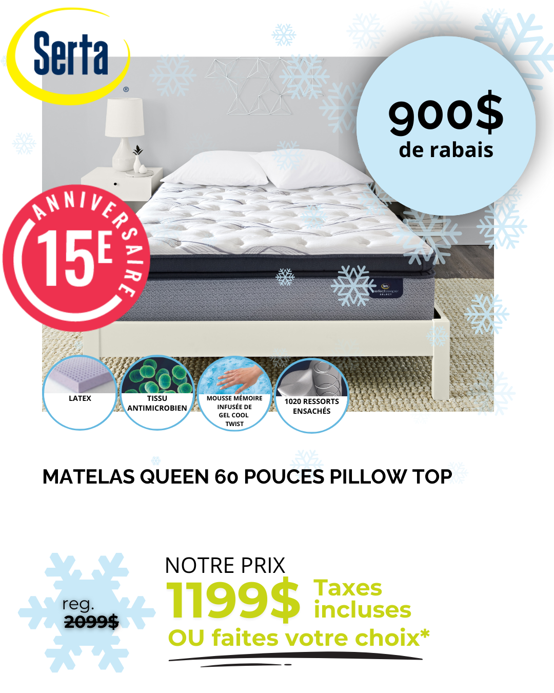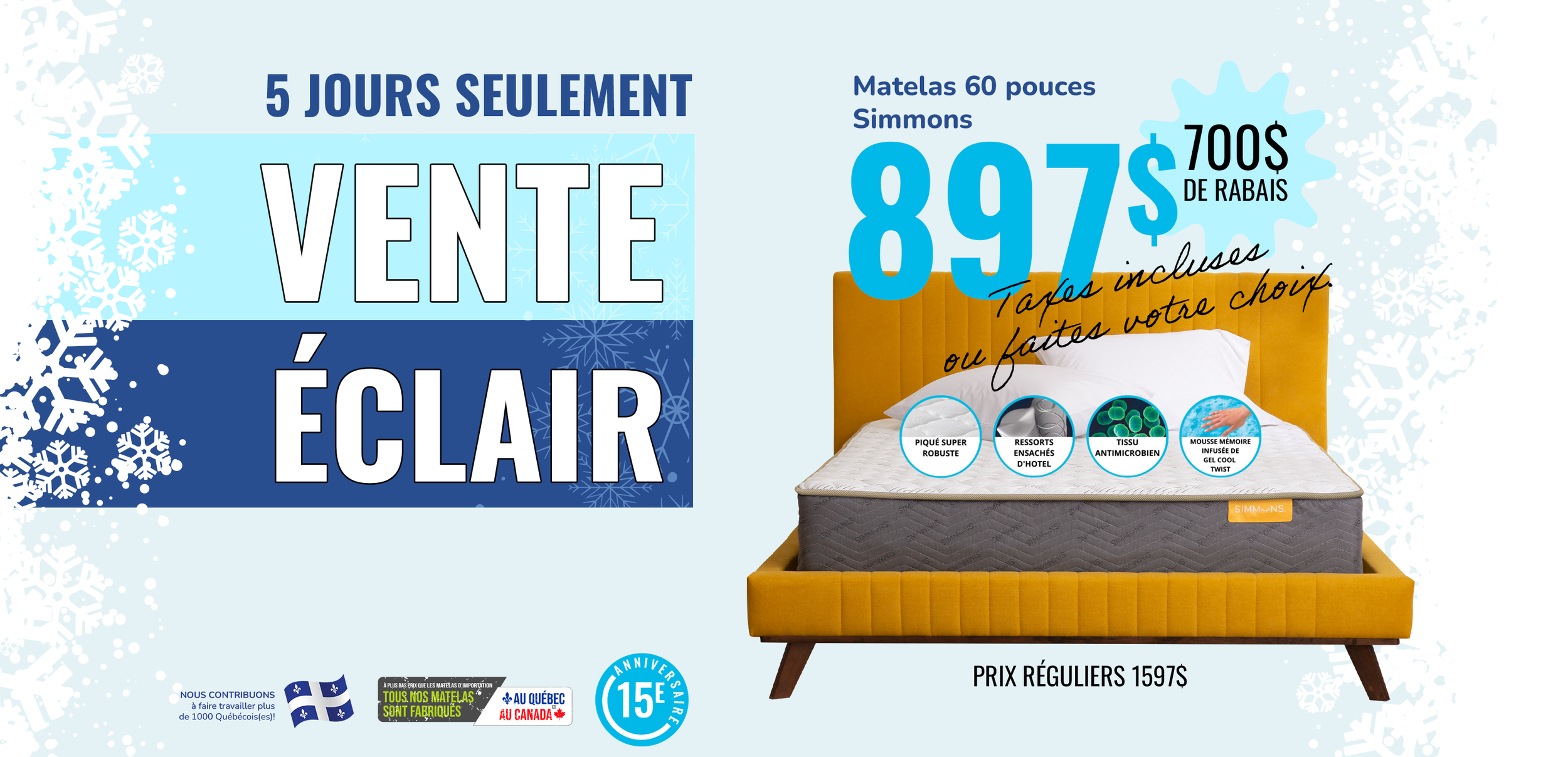 *Rabais déjà appliqués sur les prix affichés. Ne peut être jumelé à aucune autre offre. Détails en magasin. *Sur prix suggéré du fournisseur. Détails en magasin. ** Nous payons l’équivalent de la TPS et de la TVQ. Détails en magasin. *** Jusqu’à 36 versements égaux avec dépôt de l’équivalent des taxes. Frais annuels de 35$. Détails en magasin. † À l’achat d’un matelas d’une valeur minimum de 999$ avant taxes. ††† Nous payons les taxes pour vous. Détails en magasin. S.A.C. Aucun ajustement de prix sur les promotions antérieures, même si la marchandise n’a pas encore été livrée. Le marchand ne peut être tenu responsable des erreurs techniques et typographiques qui auraient pu s’y glisser. Les articles peuvent différer légèrement de ceux illustrés, malgré tout soin apporté à la préparation de cette circulaire. Livraison gratuite. Détails en magasin.