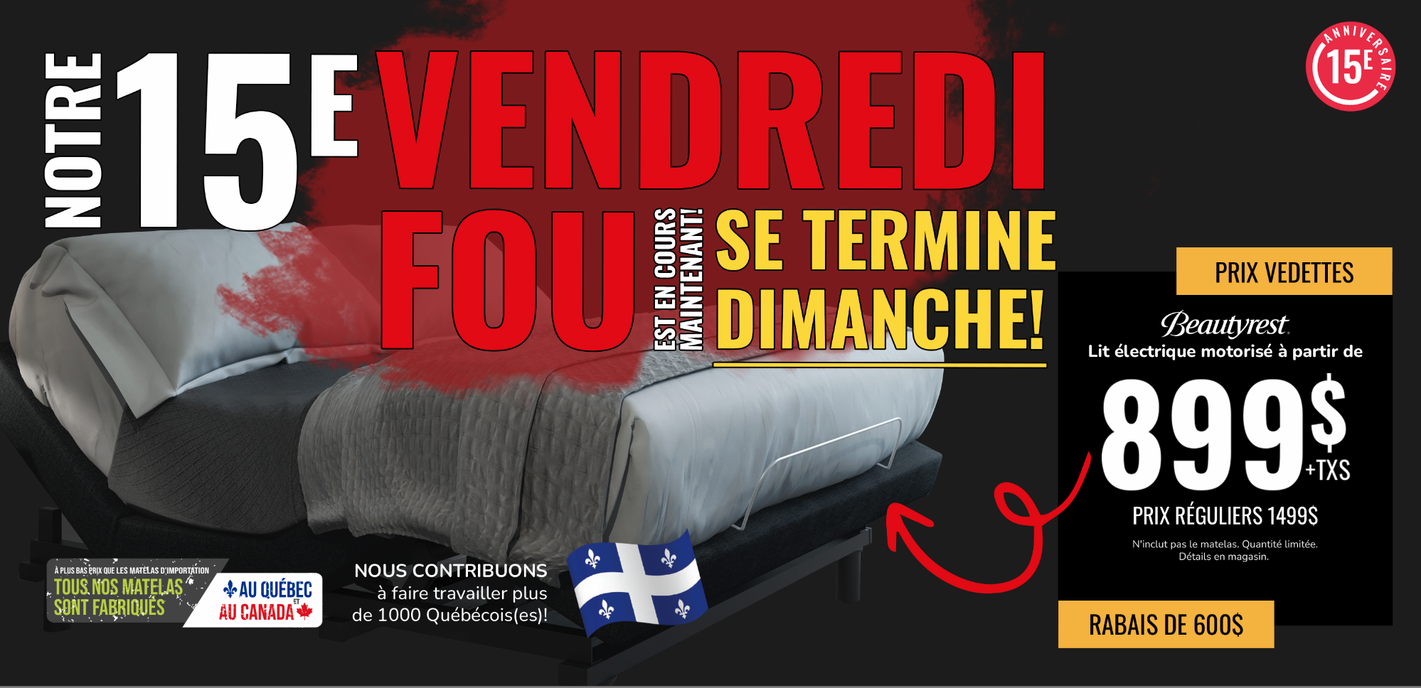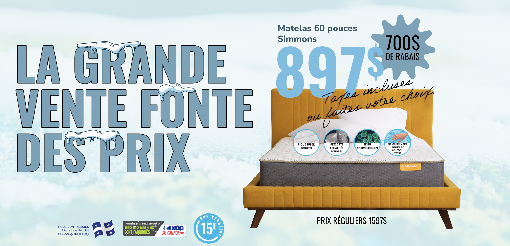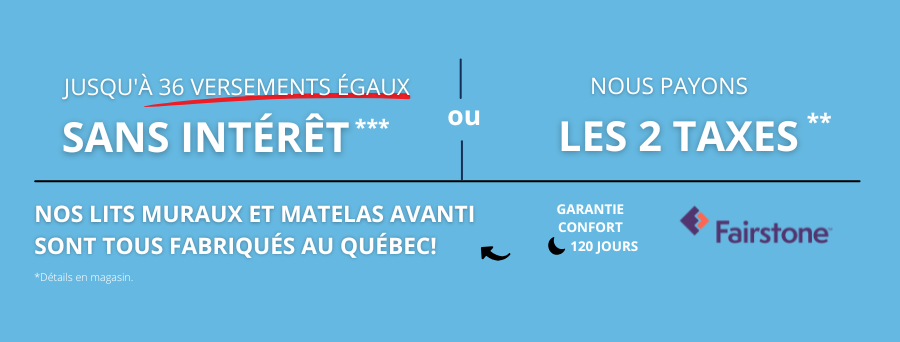 *Rabais déjà appliqués sur les prix affichés. Ne peut être jumelé à aucune autre offre. Détails en magasin. *Sur prix suggéré du fournisseur. Détails en magasin. ** Nous payons l’équivalent de la TPS et de la TVQ. Détails en magasin. *** Jusqu’à 36 versements égaux avec dépôt de l’équivalent des taxes. Frais annuels de 35$. Détails en magasin. † À l’achat d’un matelas d’une valeur minimum de 999$ avant taxes. ††† Nous payons les taxes pour vous. Détails en magasin. S.A.C. Aucun ajustement de prix sur les promotions antérieures, même si la marchandise n’a pas encore été livrée. Le marchand ne peut être tenu responsable des erreurs techniques et typographiques qui auraient pu s’y glisser. Les articles peuvent différer légèrement de ceux illustrés, malgré tout soin apporté à la préparation de cette circulaire. Livraison gratuite. Détails en magasin.